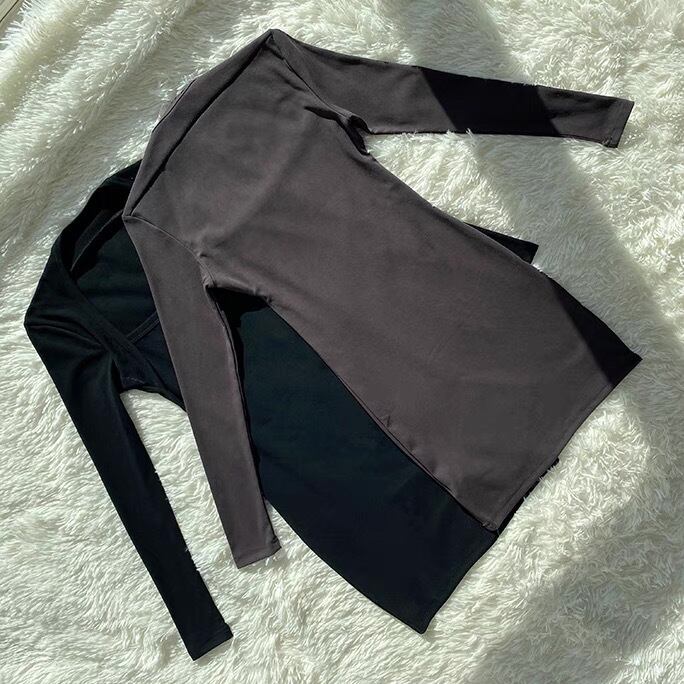 まるで長袖トップスとワンピースを着たのようなデザインは、フェイクデザインで1着でこのスタイルが完成します。