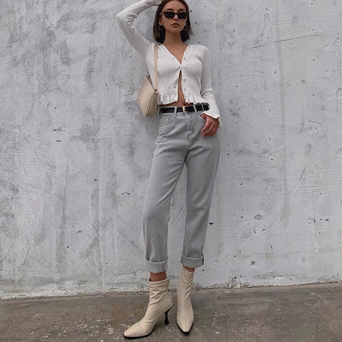 クロップド丈なので、女性らしさと華奢さが引き立ちます。また、Vネックがデコルテを美しく見せてくれる他、スリムフィットのシルエットでスタイルアップ効果も期待できます。