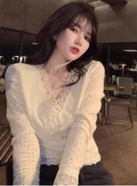 Vネックが女性らしい印象のカーディガンです。レースのデザインが特徴的です。普段使いから、デートやお出かけさまざまなシチュエーションにお使いいただけます。