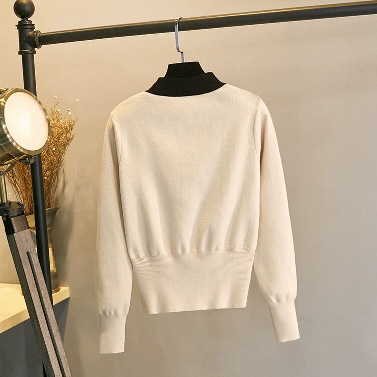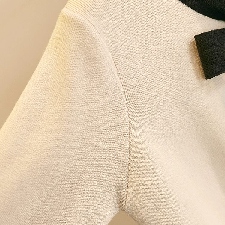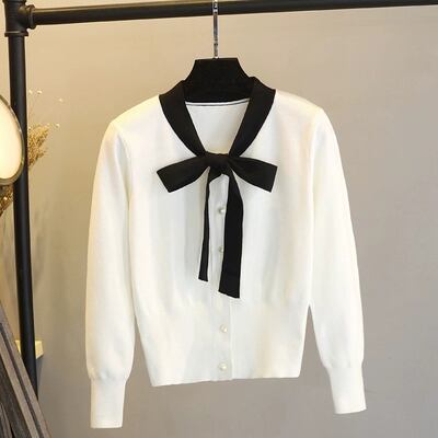 Vネックとリボン、前開きのデザイン、パール調のボタンで、女性らしい華やかさを演出します。