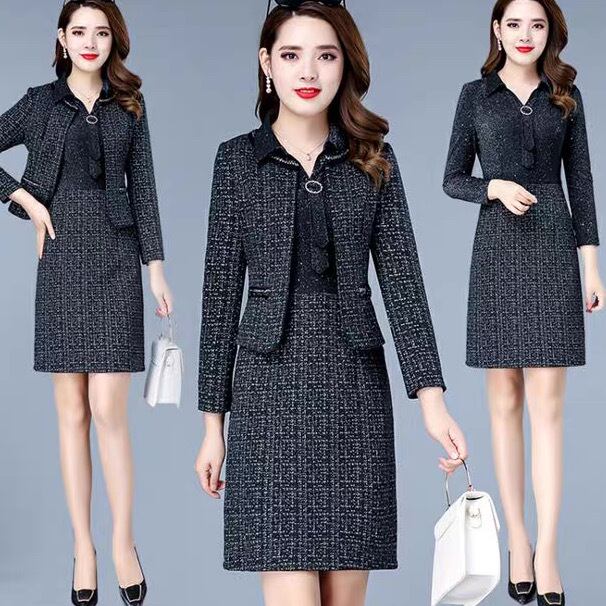 2点セット セットアップ ワンピース ジャケット ひざ丈スカート ひざ丈 膝上 袖あり 長袖 襟付き スリムフィット ポケット ハイウエスト 上下セット ツーピース 柄 ツイード ミックス きれいめ 大人 上品 おしゃれ お洒落 エレガント 春 秋 冬 入学式 入園式 卒業式 卒園式 謝恩会 30代 40代 50代 レディース 女性用 婦人服 着回し 普段使い 韓国 韓国系 オルチャン ファッション コーデ スタイル 黒 ブラック サイズ M L XL 2XL 3XL 4XL 大きいサイズ ビッグサイズ