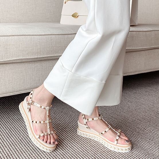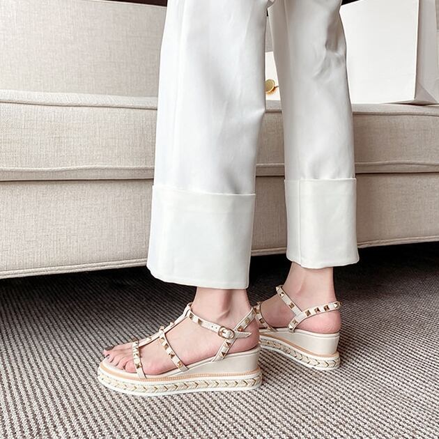 シューズ サンダル レディースシューズ スタッズ 5cmヒール ウェッジ フラット オープントゥ 歩きやすい 履きやすい 無地 柄 大人可愛い シンプル カジュアル おしゃれ お洒落 かっこいい エレガント フェミニン 個性的 クール モード系 主役級 存在感 春 夏 秋 冬 10代 20代 30代 レディース 女性用 デート お出かけ 女子会 休日 ショッピング デイリー 普段使い 韓国 韓国系 オルチャン ファッション コーデ スタイル インスタ映え ベージュ