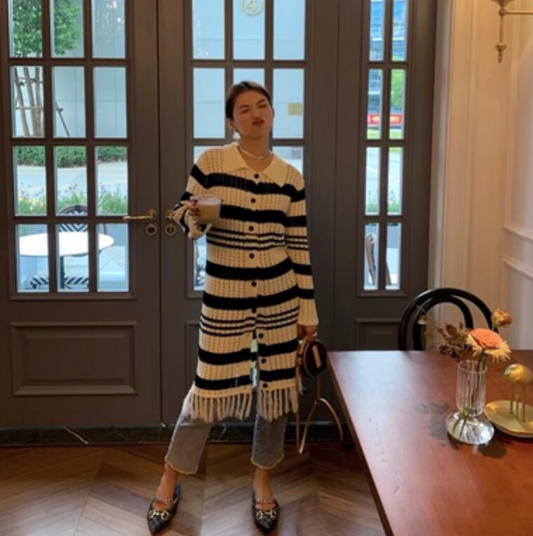 長めの丈が大人可愛い印象を与えます。様々な場面で活躍する万能アイテムです。カジュアルなデニムスタイルやフェミニンなスカートスタイルにも合わせやすいのが魅力です。ぜひワードローブに加えてください。